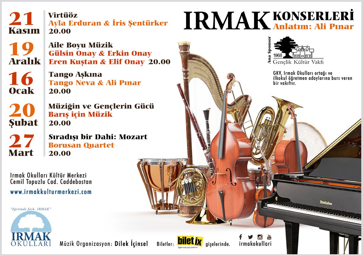 Toplumsal bir sorumlulukla hareket eden ve özgün bir eğitim veren Irmak Okulları, bu konserler vasıtasıyla 450 kişilik salonunu Kadıköylü sanatseverlerin hizmetine sunarak, bölgede bir kültür vahası olmayı amaçlıyor. Biletix tarafından satışa sunulan biletlerden elde edilecek gelir, Gençlik Kültür Vakfı tarafından ilkokul öğretmen adaylarına burs olarak verilecek. Ayrıca, tüm müzik öğretmenleri ve konservatuvar öğrencileri de etkinlikleri ücretsiz olarak izleyebilecek.